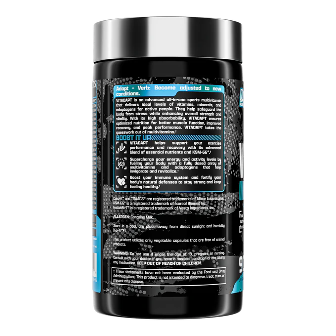 VITADAPT is an advanced all-in-one sports multivitamin that delivers optimal levels of vitamins, minerals, and adaptogens for active people. Whether you're a dedicated athlete or a fitness buff - VITADAPT helps safeguard your body from stress while enhancing overall strength and vitality. With its high absorbability - VITADAPT ensures optimized nutrition for better muscle function, improved recovery, and more importantly, peak performance. It's the best multivitamin for men and women who demand the most from their bodies. Try it and feel the difference - get your VITADAPT today.